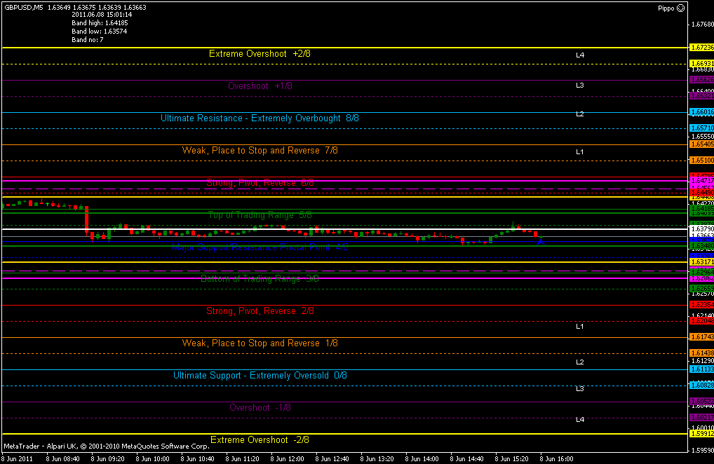 大多数市场大部分时间都在乐队的中心徘徊。我们对这些并不感兴趣。我们等到市场达到标记为L1,L2,L3,L4(“1级”,“2级”)等的水平。当它达到其中一个水平时,我们以与市场走势相反的方向交易,所以: