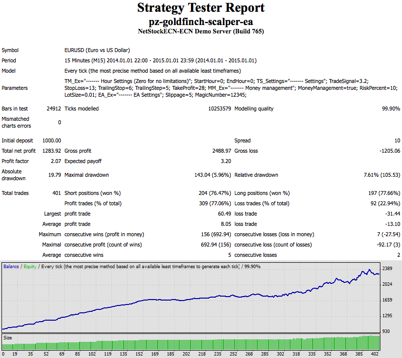 较佳的经纪商, 低点差和停止级别。 较佳的互联网连接。 充足的资金。 Goldfinch Scalper的回测:该 EA 使用即时报价数据。请在 M15 时间帧的 “每个即时报价” 模式回测,并尝试发现最佳参数。建议在 MetaQuotes 演示帐户回测该 EA。如果您的经纪商可以处理紧凑的追踪止损,性能会增长。