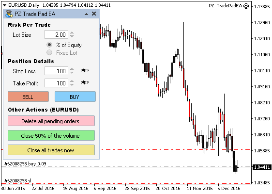 Trade Pad EA 2.0的功能:Trade Pad EA能轻松地从图表中进行交易。它为您处理风险管理,并可以使用您现有的交易执行几项有用的任务。