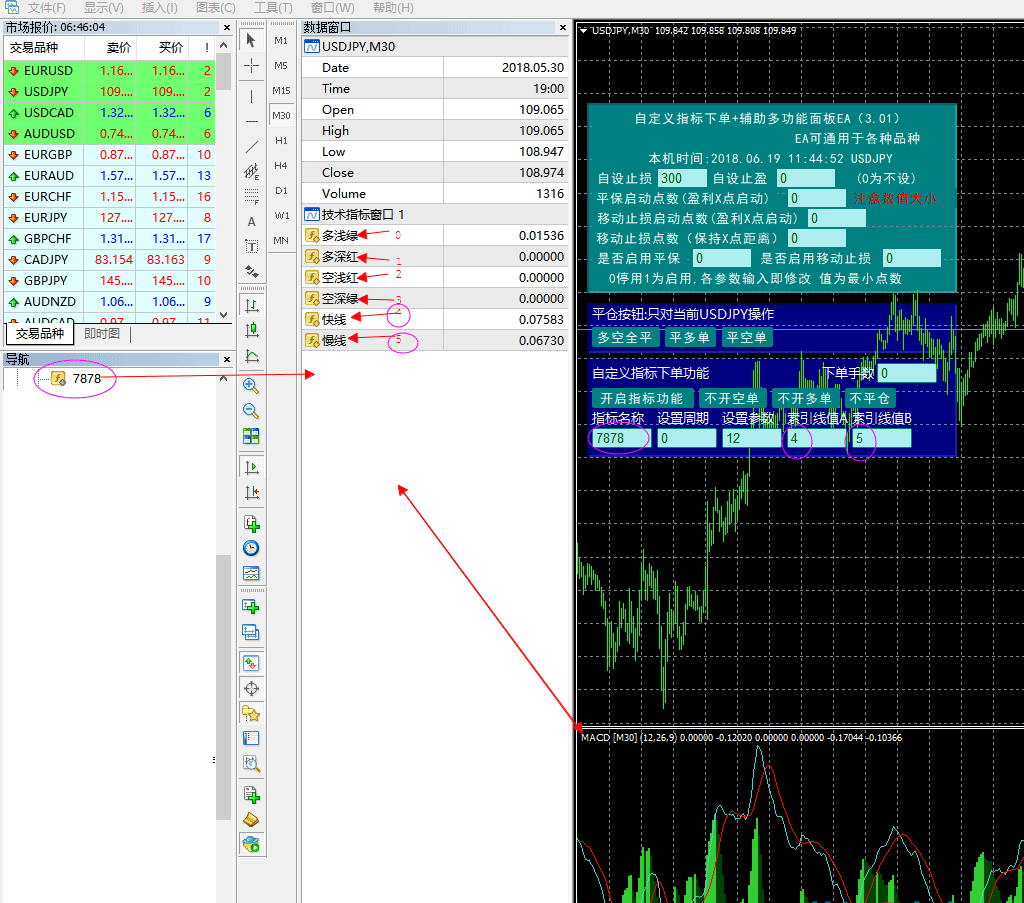 【3.00】★★支持自定义指标调入下单!此功能市面上绝无仅有!目前支持到两条线的EA,不懂编写EA的人也能轻松玩上EA,输入下单量,输入自定义指标名称(需数字化),输入周期(分钟),设置参数(先支持1个参数),对应的索引线(指标线),EA会在这个双线指标金叉或死叉执行买入或反向时卖出,支持1单的交易,不影响其它本货币对非此EA的开单。(更新时间20180618端午节)