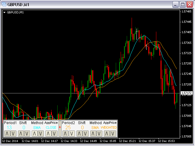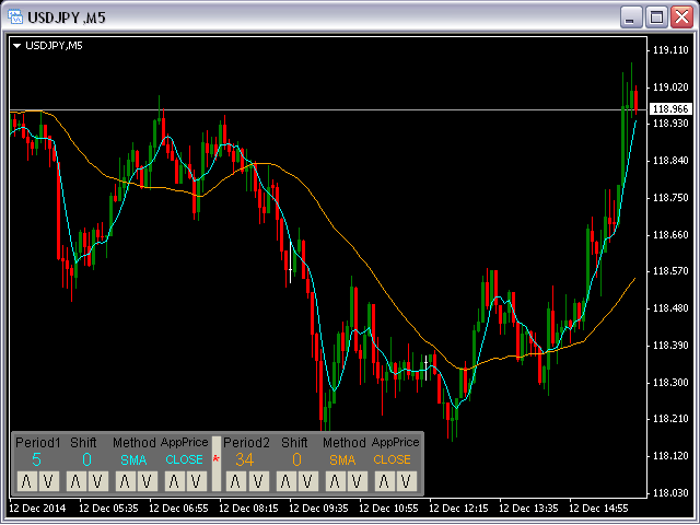 This panel will be very useful for a research of a trading strategy system. The MA-ControlPanel is based on the very popular Moving Averages indicator. You will be able to change the indicator parameters: Period , Shift , Method and Apply Price by clicking on the Up ( /\ ) and Down ( \/ ) buttons. You may choose your favorite colors using parameters BackGround, maColor1 and maColor2.