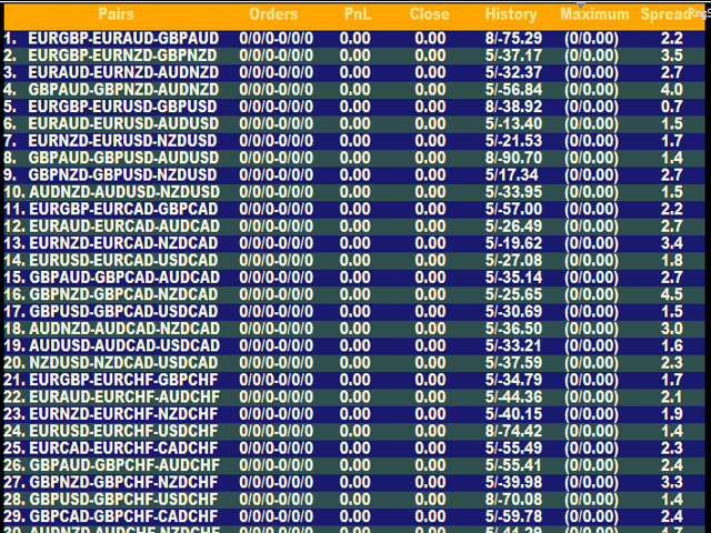 Can to delete some currencies from external parameter if you want to use less currencies. The parameter called: ' Currencies To Make Pairs' "EUR/GBP/AUD/NZD/USD/CAD/CHF/JPY".