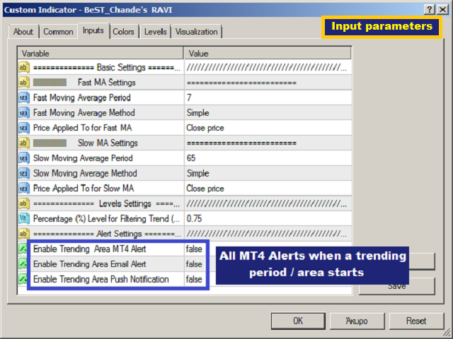 By default RAVI is defined by the formula: RAVI = Absolute value (100 x (SMA(7) – SMA(65)). Also by default there is an arbitrary reference level of 3% that means a market is ranging if the RAVI is less than 3%, or trending strongly if it is is greater than 3% (see about “ Beyond Technical Analysis. How to Develop and Implement a Winning Trading System ” by T.Chande).