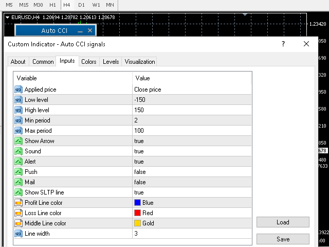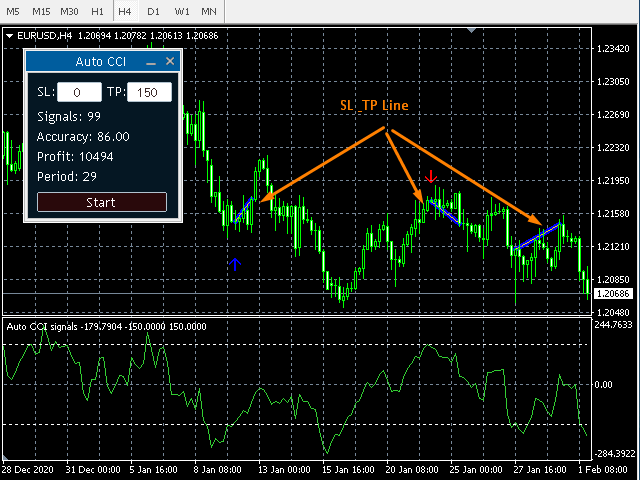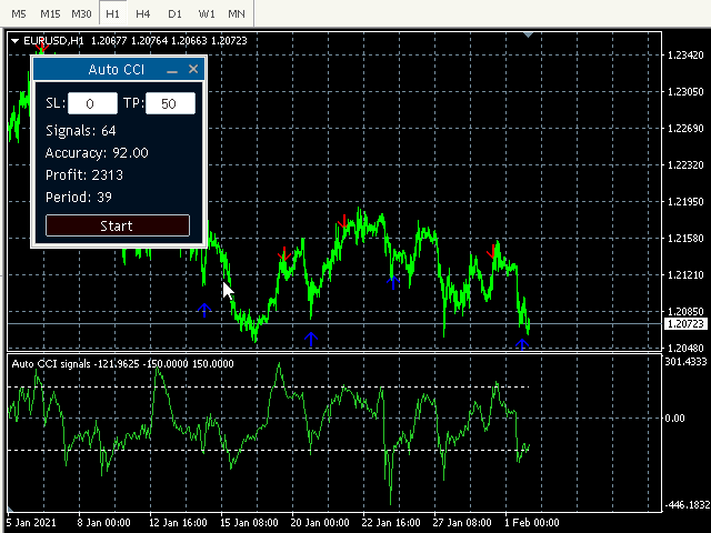 Indicator automatically defines the most efficient period, during which the accuracy of the signals on a given chart is at its highest. Period efficiency and signal accuracy values are displayed in the panel of a price chart. Depending on a symbol and time period, the accuracy of the indicator signals can reach 90%. The indicator period is calculated using overbought/oversold levels set in the inputs. After the most efficient period is found for CCI, the indicator itself is constructed. Buy and sell signals are also displayed on a price chart.