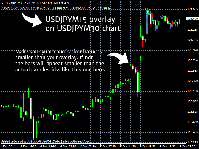 - Please make sure that the timeframe you choose to overlay is LARGER than the chart you are attaching it to.