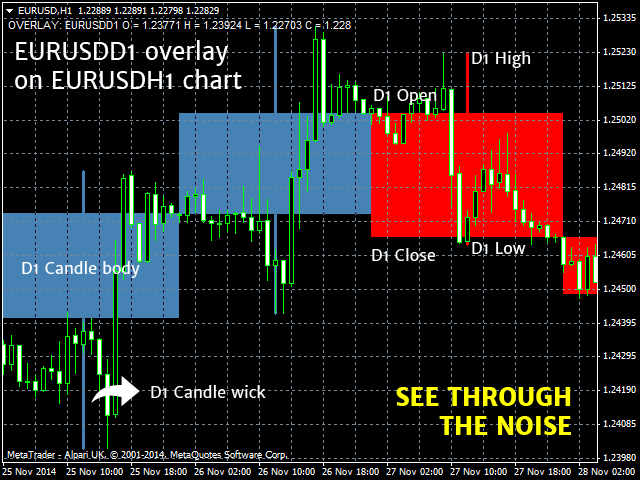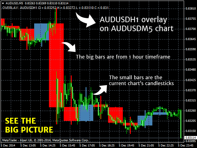 The TIL Timeframe Overlay indicator is the perfect tool for multiple timeframe analysis . It does the simple yet powerful task of overlaying a candlestick chart of a different timeframe over another allowing you to see the BIGGER picture and see the underlying TREND amid the noise and volatile price action. Please see the screenshots below for examples.