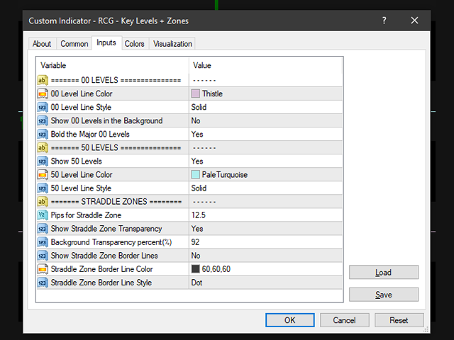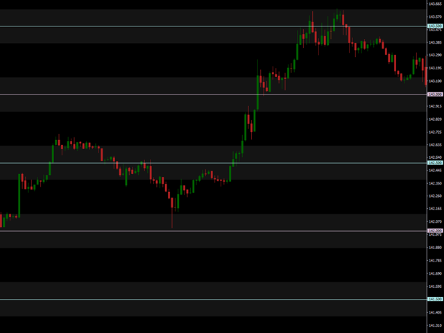Indicator cleanly displays even numbered price levels: “00s” and “50s” . Additionally, you can display “Mid-Lines” which are preset distance levels on both sides of the even numbered price levels (set to 12.5 pips by default). This 25-pip zone that straddles each even numbered price relates to where many traders place their stops and therefore can be a risk “Zone” to steer clear of when placing your stops. The zone also acts as support and resistance.
