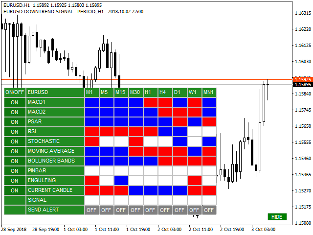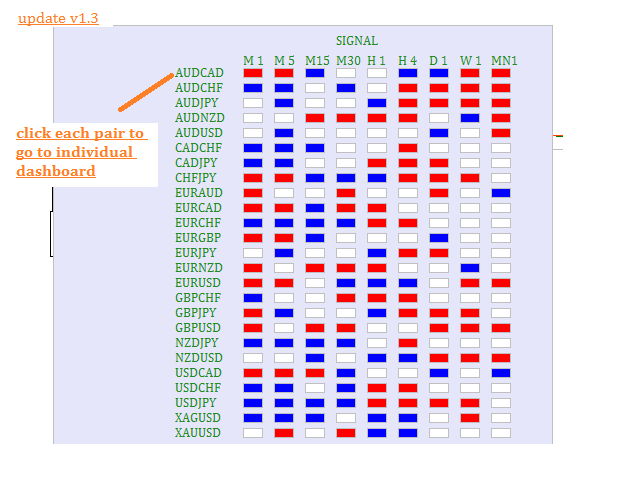 This dashboard scans all time frames(M1,M5,M15,M30,H1,H4,D1,W1,MN1) and shows up trend and down trend for MACD, PSAR, RSI, STOCHASTIC, MOVING AVERAGE, BOLLINGER BANDS by changing the colours of the relevant boxes. It also shows candle stick pattern such as PINBAR, ENGULFING and current candle raising or dropping. The default color for up trend is blue and down trend is red.