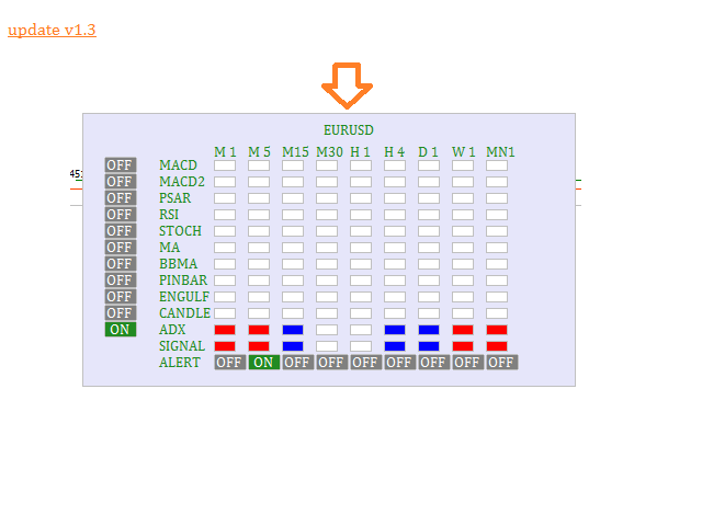 · SEND ALERT ON/OFF BUTTON: click the button to select which time frame to send signal for pop-up desktop alert and note a comment on top right corner of MT4 screen.