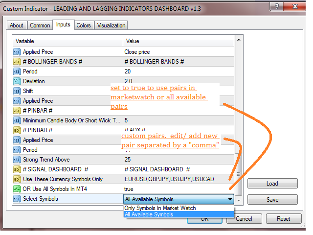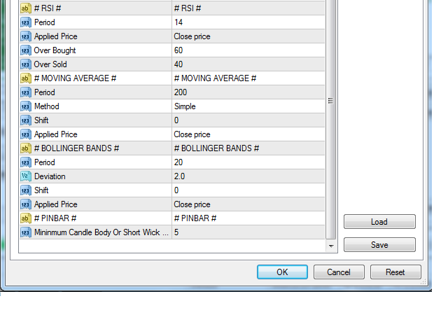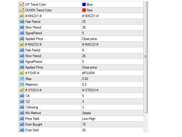 All the indicators parameters for MACD 1, MACD 2, PSAR, STOCHASTIC, RSI, MOVING AVERAGE, BOLLINGER BANDS and PINBAR can be changed as of your preference.