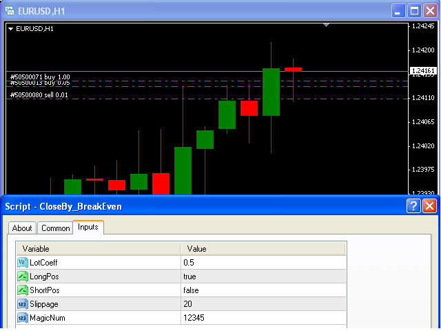 Let's say you have 1 lot for a Long position with positive profit. With this script you can close any part of the 1 lot (input parameter LotCoeff from 0.1 to 0.9) and remain (for example, 0.4 lot) will have a BreakEven StopLoss.
