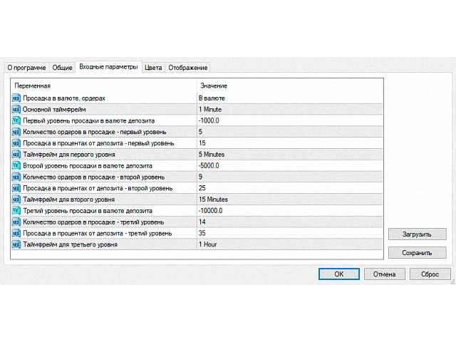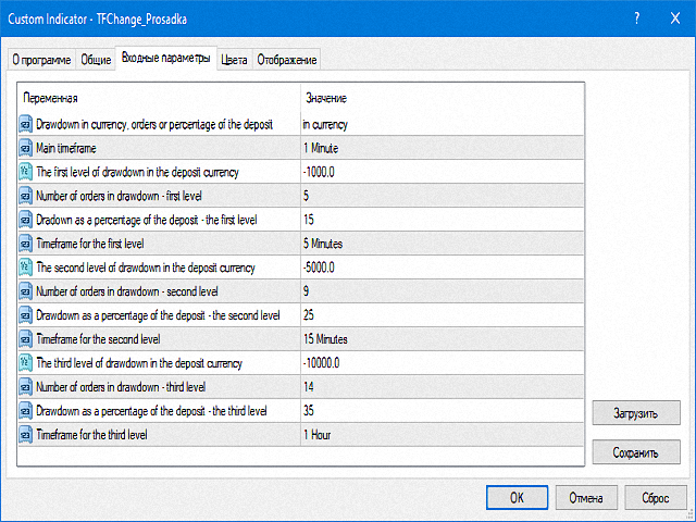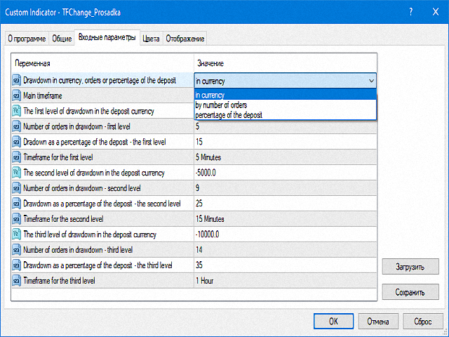 You can set the drawdown in the deposit currency, the number of orders in one direction or the percentage of the deposit, at which the current timeframe will change to the selected one.