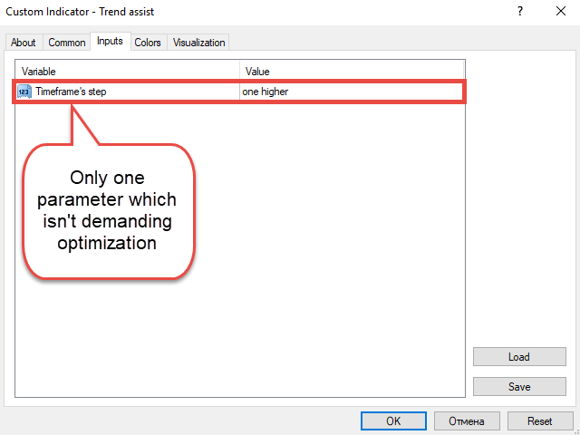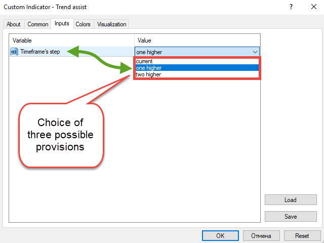 - Timeframe's step - timeframe for the second indicator line (it can be current, one or two timeframes higher than the current one)