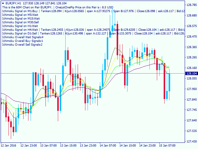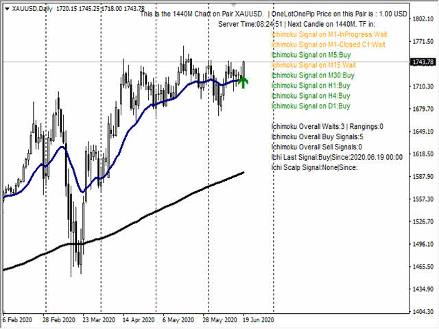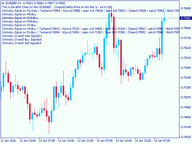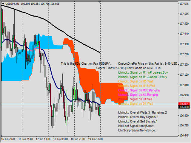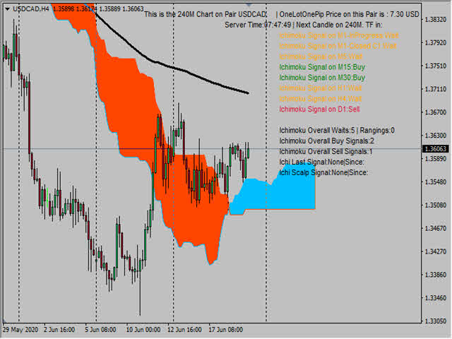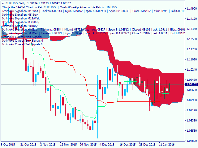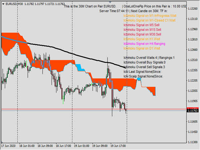 This is a multi-timeframe Ichimoku Kinko Hyo signal analyzer indicator. As you know, Ichimoku consists of 5 lines (Tenkan-sen, Kijun-sen, Chikou Span, Senkou Span A & B which create the Kumo Cloud).