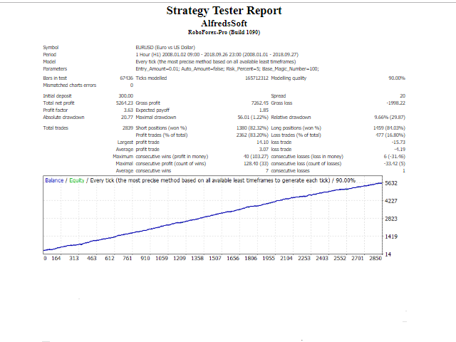 AlfredsSoft is a unique trading system consisting of several advisers. It was conceived as a safe portfolio for long-term investment. It includes scalp, flat and trend advisers.Not martengel, no grid, no hedging. Always uses a stop-loss and take profits, or specifies the conditions for exiting the position.Use on the EURUSD pair. Timeframe H1. Deposit 300 $ for 0.01 lot!Has successfully passed the test since 2008 with a spread (20).For better performance, use a broker with a low spread and preferably an ECN account.For automatic lot set parameter 5 to $ 300