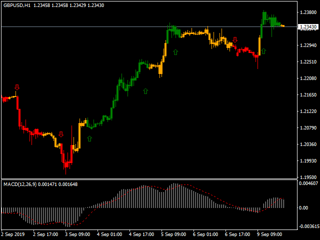 The MACD Signal Candle indicator changes color according to the MACD trends.