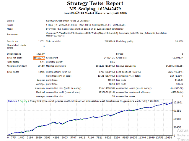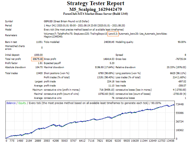 M5 Scalping is a fully automatic scalping Forex robot on the M5 timeframe. It is designed to work on the Metatrader4 platform. This robot uses in the algorithm of its work new developments in market analysis and support of open orders. After being installed on the chart, the robot begins to actively trade and open from 1 to 10 trades per day. This is the average. Also, the robot, with the arrival of each tick, controls the growth and drawdown values in such a way as to prevent large losses in the event of sharp and unpredictable price movements. In other words, the robot tries to constantly monitor and protect the client's deposit from unexpected market surges based on the release of negative news.