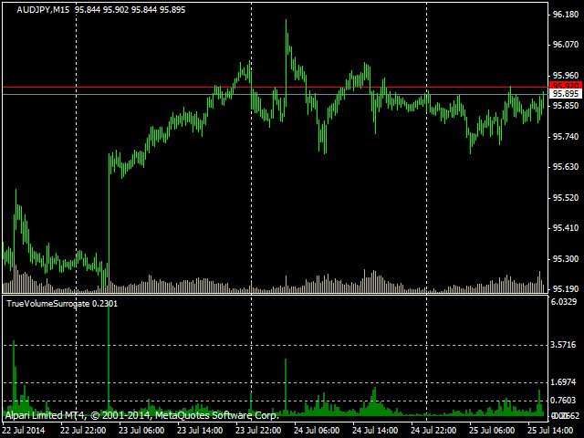 This indicator provides a true volume surrogate based on tick volumes. It uses a specific formula for calculation of a near to real estimation of trade volumes distribution , which may be very handy for instruments where only tick volumes are available. Please note that absolute values of the indicator do not correspond to any real volumes data, but the distribution itself, including overall shape and behavior, is similar to real volumes' shape and behavior of related instruments (for example, currency futures).