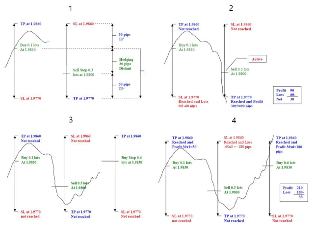 So when you hit the SL of the first Buy, you also hit the TP of the Sell, which is 2 o 3 times bigger than the SL.