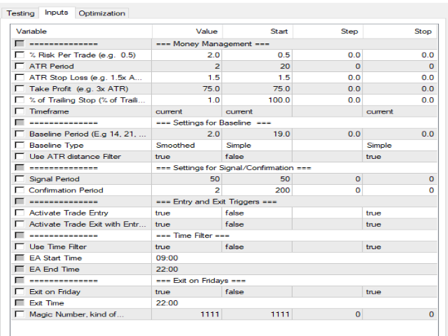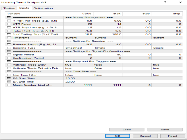 Nasdaq Trend Scalper is designed with trend following strategy with ATR Volume. It has built into it, Money management with percentage of risk to trade, Exit strategy aside from the regular stop loss for every trade. It also has a trailing setting in percentage of Stop as well as time filter for the EA to trade at certain times of choice.