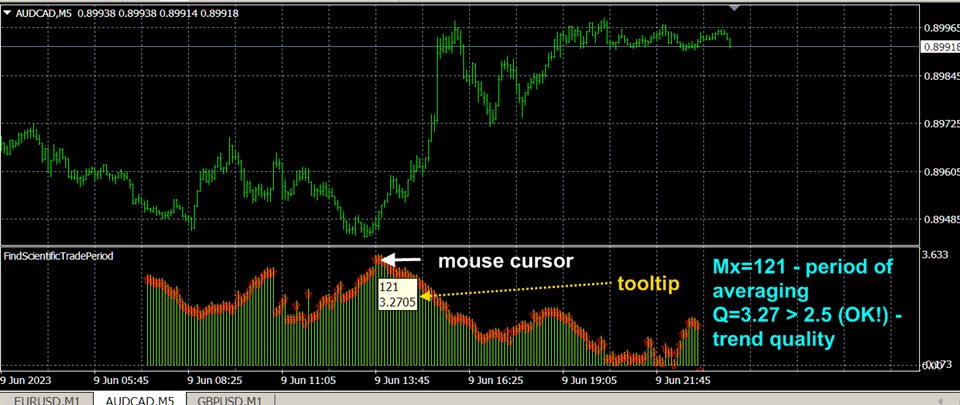 On the horizontal (time for conventional indicators) axis of the FindScientificTradePeriod indicator, the averaging period "M" is plotted, and on the vertical axis, the forecast values of certain parameters calculated by the CalculateScientificTradePeriod script are plotted. By default, the CalculateScientificTradePeriod script predicts the trend quality indicator Q (which is described by the Quality trend indicator in real time and on the price history) on a set of future time periods starting with a length of 10 bars from the current bar into the future and ending with a length of 200 bars from the current bar of the corresponding timeframe , which forms the function Q(M) of the quality of the trend future trend at different time intervals. The optimal period Mx corresponds to the maximum Mx=max Q(M) of the trend quality function, which (maximum) is located according to the chart displayed by the FindScientificTradePeriod indicator. To determine the optimal period to the maximum of the function (to the red bar), you need to move the mouse cursor and the value of this period and the value of this function will be displayed in the tooltip. At the same time, you need to look for a smoothly drawn maximum without random beats of the displayed parameter, which are mainly characteristic of small intervals. The desired maximum value should be greater than 2.5.