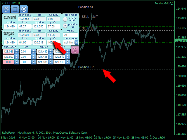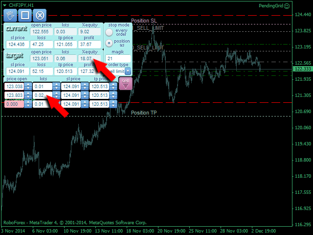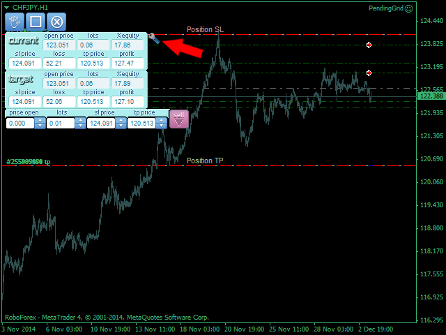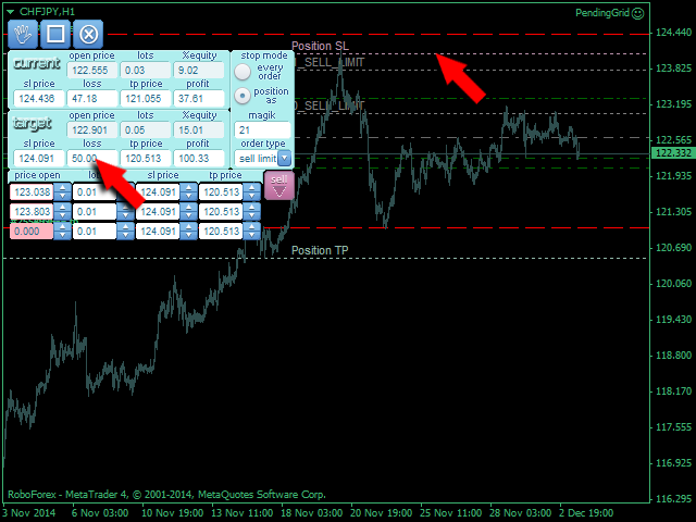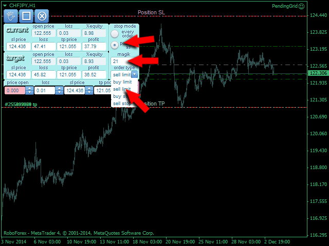 A mouse click with a preliminary short hit on: Ctrl - adds a new pending order, "up arrow" - adds/modifies upper stop level, "down arrow" - adds/modifies lower stop level.