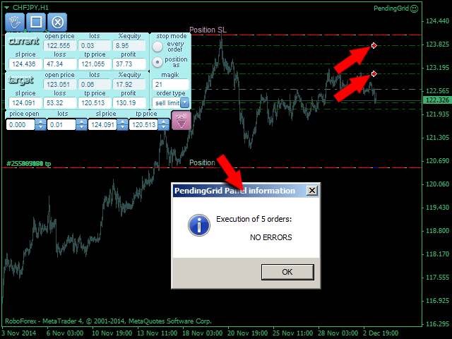 The analyzer panel allows traders to add the pending order grid (Buy Limit, Sell Limit, Buy Stop, Sell Stop) quickly and efficiently.