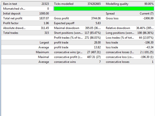 This is a simple but potentialy effective if used right , based on trades opened if gaps occur between candles in reverse sense of price movement with TakeProfit set at 100 Points and Stop at 100 Points. Works best on GPB/USD and EUR/USD , Timeframe H1 . It also has Smart Lot management function that increases lot size on wining trades and decreases lot size on losing trades and Magic Number to differentiate orders from other EA's .