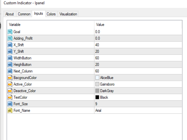 i. Set goalii. Set added profitsiii. Determine width of the panel (NEXT_Column)iv. Change background colorv. Change color for long and short buttons when activated and deactivatedvi. Text color, font and size