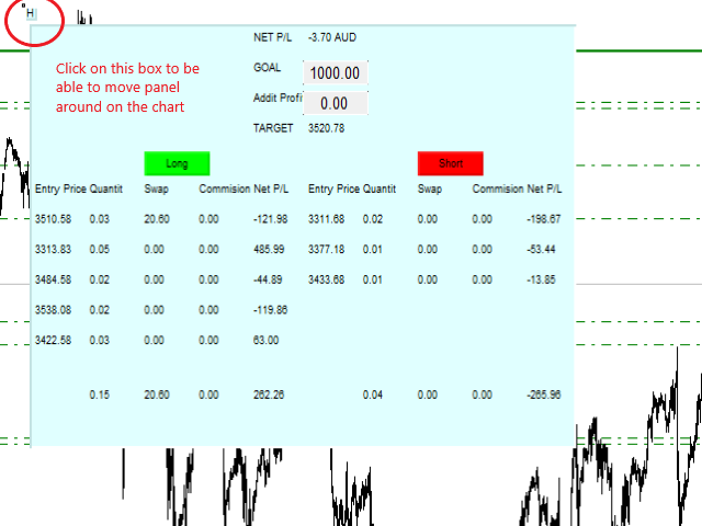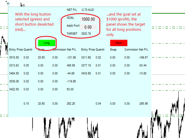 a. Whether in the inputs when you first drop the panel on to the chart, or after by entering a $ trading goal in the GOAL section of the panel, the utility will give you a price TARGET which you can set on all positions (needs to be done manually) in order to reach that GOAL - saves you having to work out these targets manually which can be frustrating if you have many positions open and also considering MT4 does not include swaps and commissions in the profit column of the trade tab in the terminal;