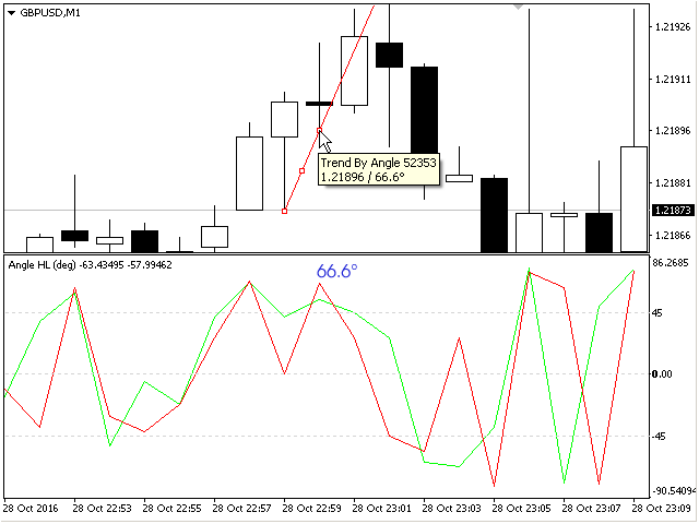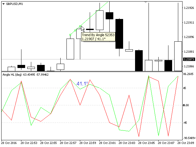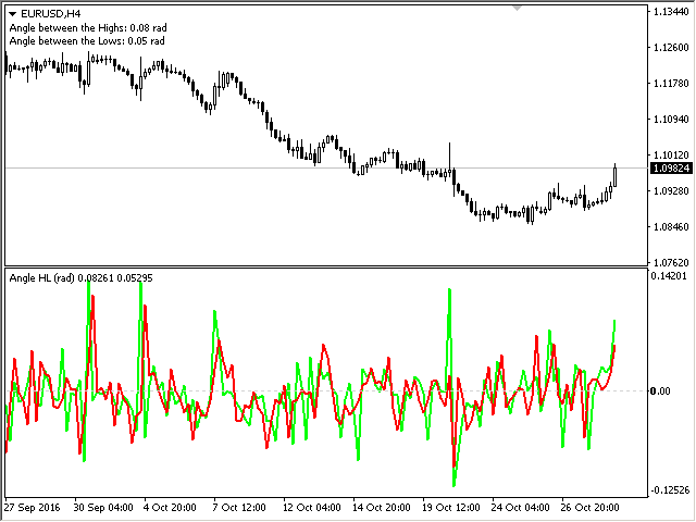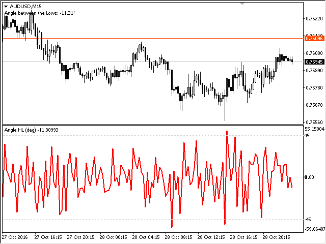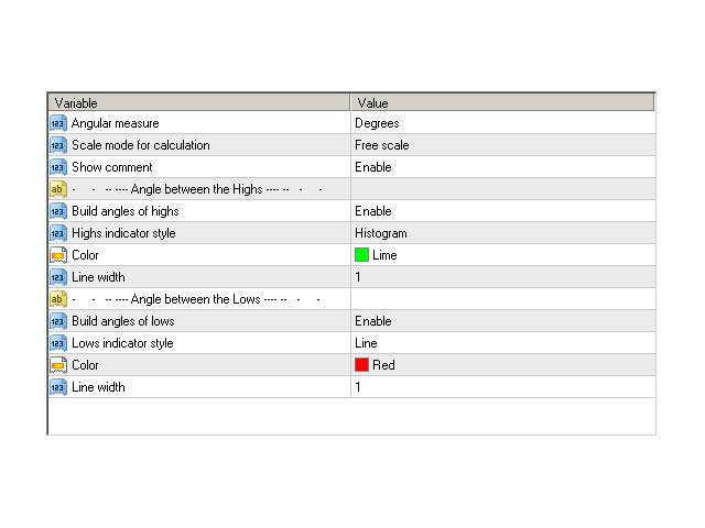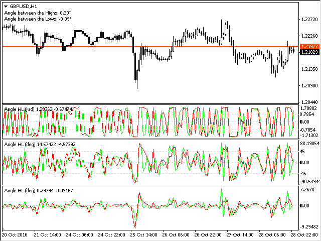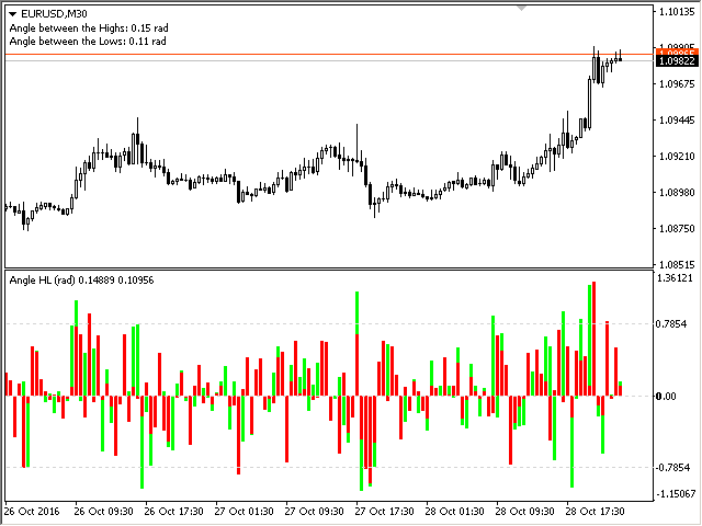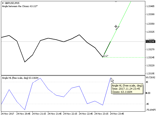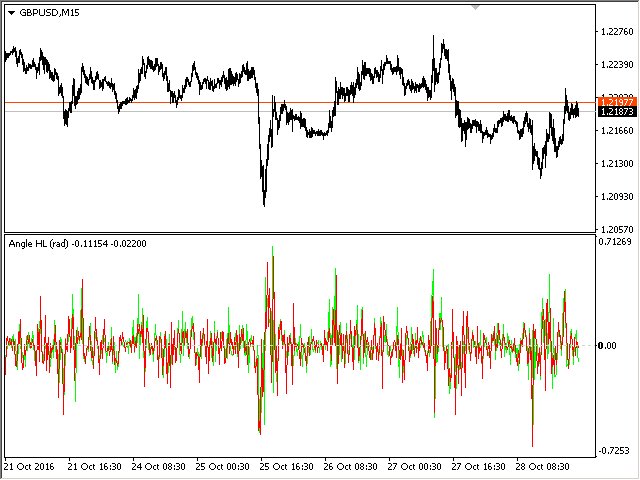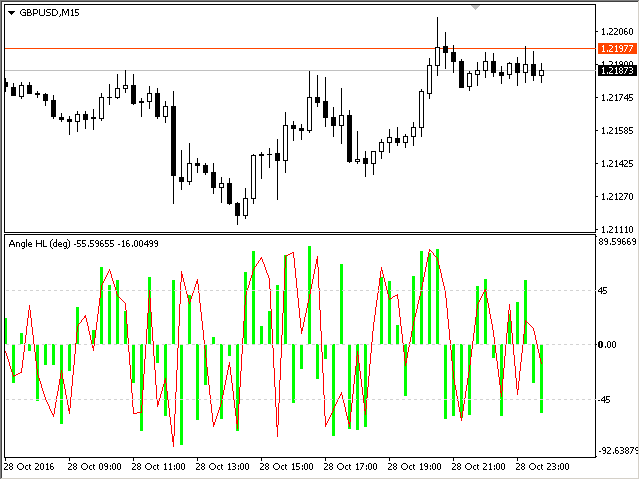 The indicator calculates the angle between the Highs, Lows and Closes of neighboring bars. The angle can be measured in degrees or radians. A linear chart or a histogram is drawn in a subwindow. You can set the scale for the calculation — floating or fixed.