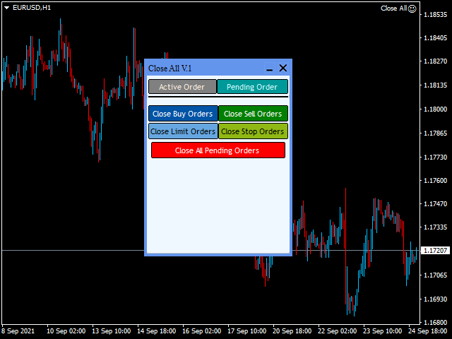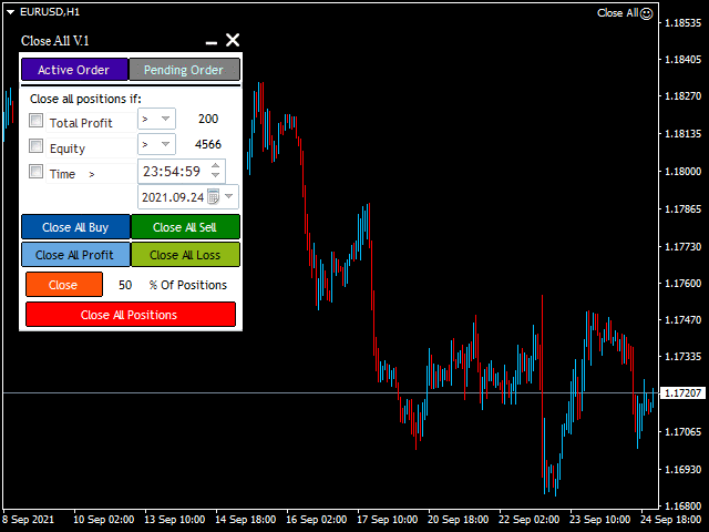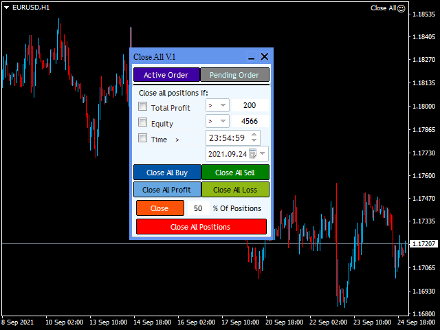 This is a very simple yet useful tool to close positions with different conditions and methods. You can use panel buttons to close positions or set multiple rules to close all positions.
