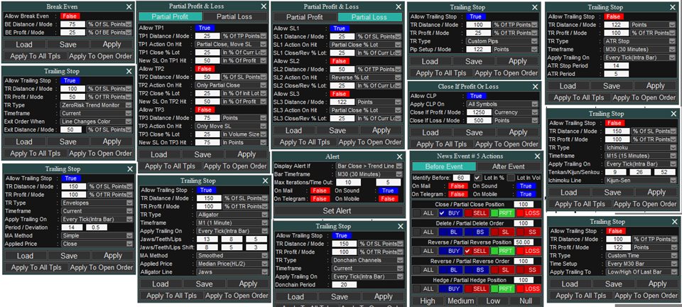 - Orders management with break even, 16 trailing stop systems, TPs, SLs and virtual SL,TP