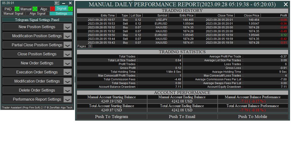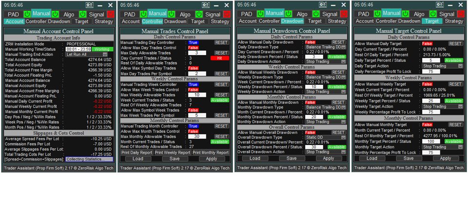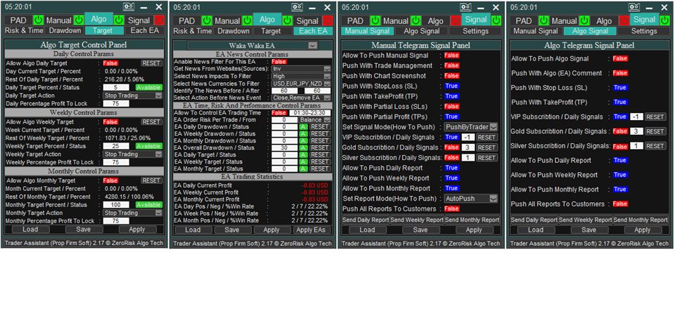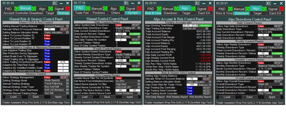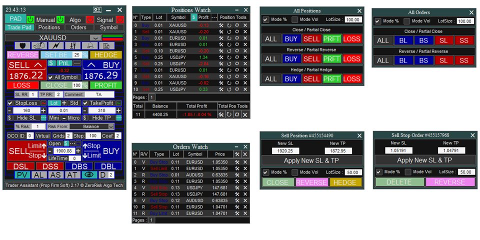 It contains four major utilities: ZeroRisk Trade Pad to open and manage trades, ZeroRisk Manual Trader , a ssistant for manual traders to control the trading plan and prop firm rules, ZeroRisk Algo Trader , assistant for algo traders to control and monitor EAs and ZeroRisk Telegram Signal Provider to send manual or EA signal to telegram.