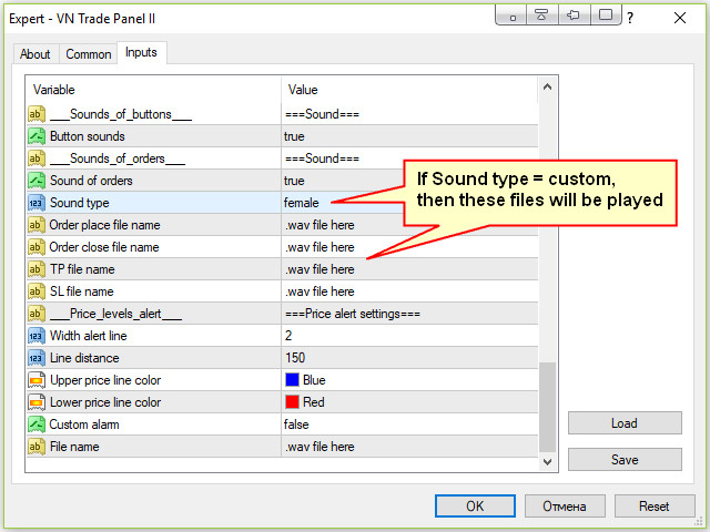 In addition, there is a possibility directly through the installation panel of price signal lines, upon reaching which the price will display a visual and audible alert. As a sound alert, a custom sound file of the "***. wav" format can also be used, which must also be placed in the terminal's Sounds folder.