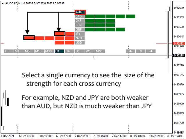 With a single currency selected, you can optionally display the % ATR values for every other currency. Values are calculated as the % ATR for the selected timeframe, and are scaled to fit the meter's dimensions. There is also an option to adjust the shift (the timeframe toolbar must be displayed), so you can see how relative strength changes over time.