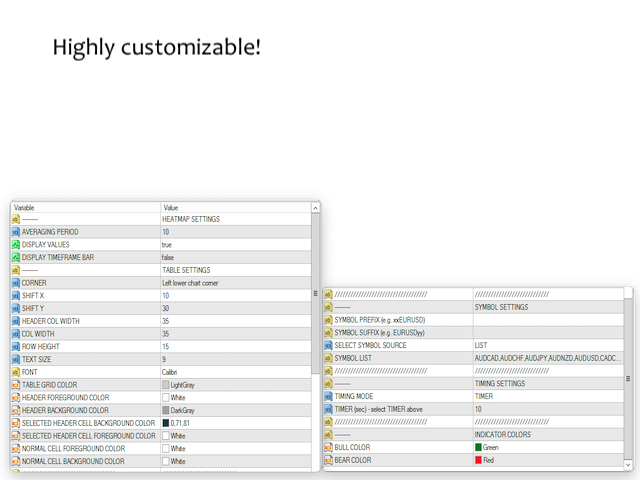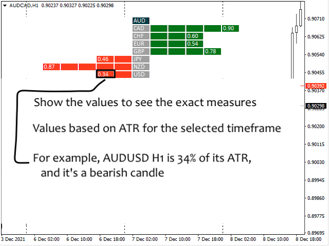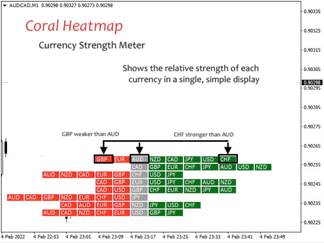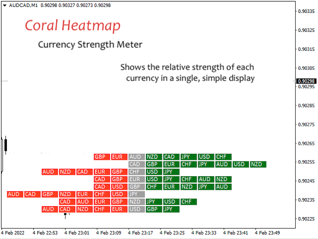 Coral Heatmap is a currency strength meter based on the ATR values for the selected timeframe. There are two main view modes: