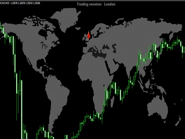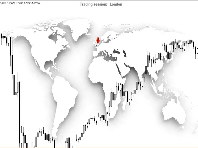 The indicator displays on the chart a map, on which markers show the current trading session, as well as shows a text.