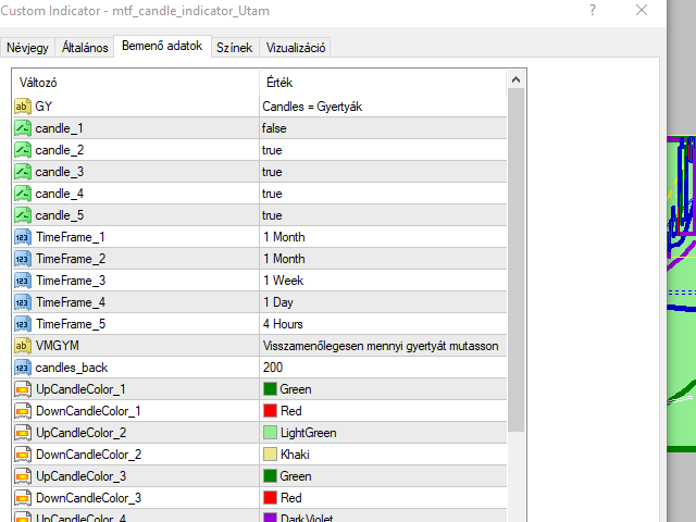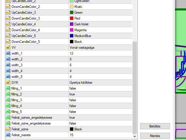 Különböző színek rendelhetők a long és short gyertyákhoz. Vonal vastagsága állítható.