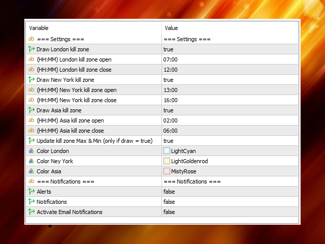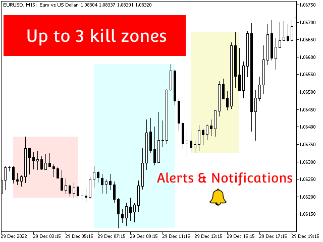 Kill Zones allows you to insert up to 3 time zones in the chart. The visual representation of the Kill Zones in the chart together with an alert and notification system helps you to ignore fake trading setups occurring outside the Kill Zones or specific trading sessions.
