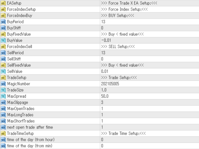 Force Index parameters such as BuyPeriod, BuyShift, BuyValue, SellPeriod, SellShift, and SellValue can be adjusted.