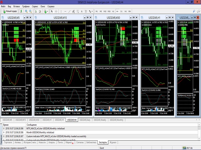 "Giant" is a flexible system in relation to trading strategies. It consists of two high-quality indicators that are installed on five different timeframes of the same currency pair (see screenshot). It monitors the trend and gives signals to open. The system passed a large number of checks and showed high accuracy.