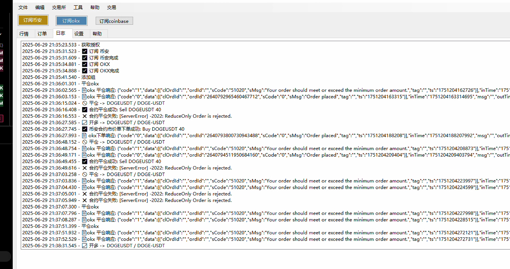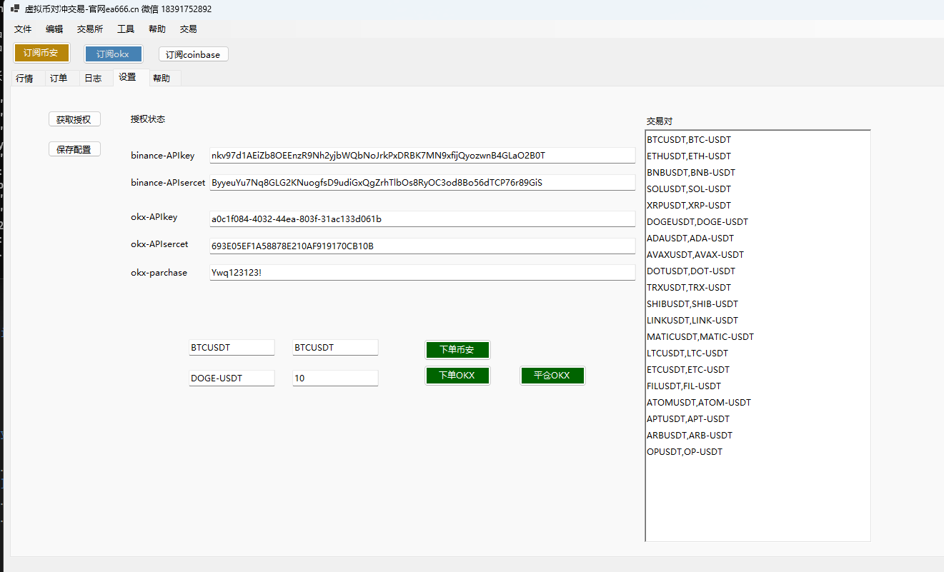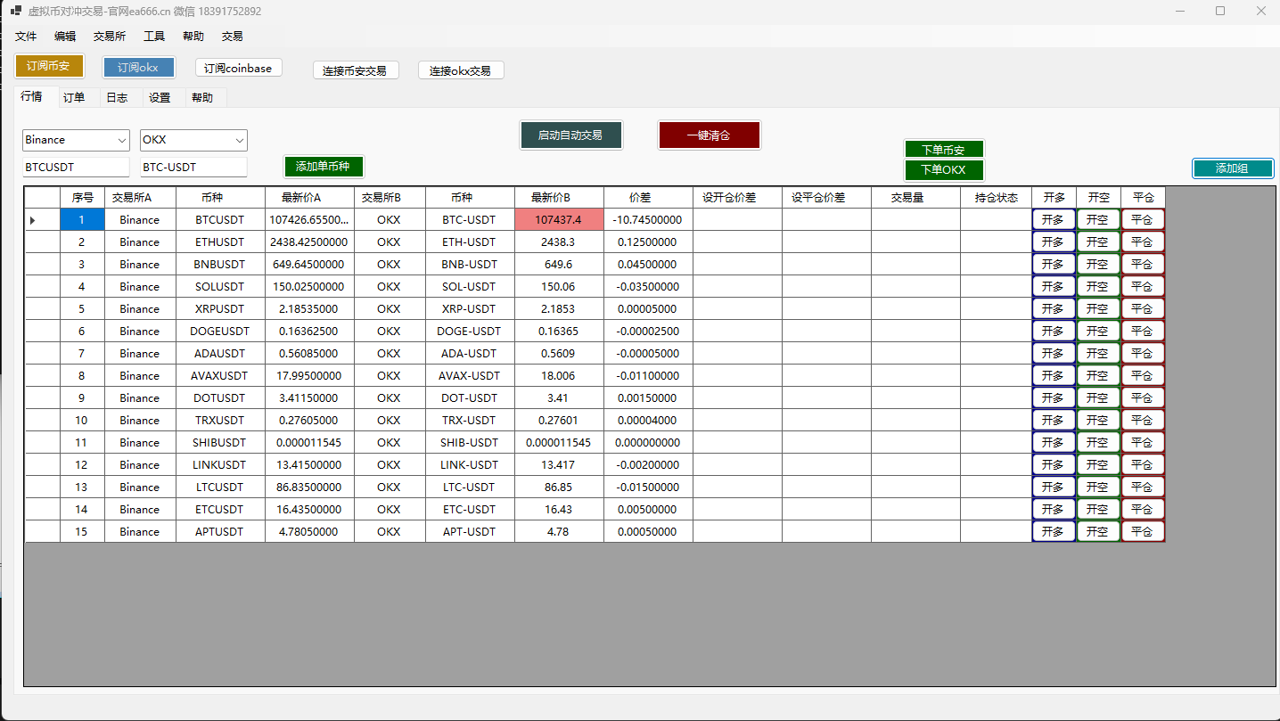 操作按钮:包括“启动自动交易”、“一键套利”、“下单币安”、“下单OKX”等,操作简便。