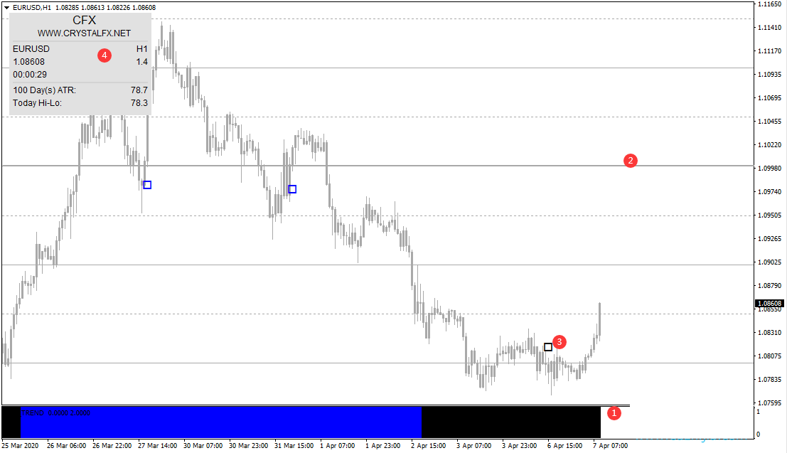 Crystal外汇交易系统,售价75美金 1. 趋势概览. 2. 水平线.(如果行情波动较慢,可以在第一根水平线位置平仓;如果波动快,那么可以在第二根或者第三根平仓) 3. 多空信号.(蓝色是做多,黑色做空) 4. 信息面板.