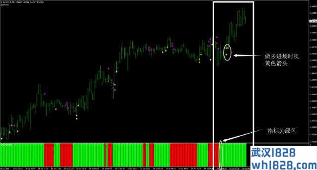 1. 做多时机:出现黄色向上箭头,下方指标为绿色。