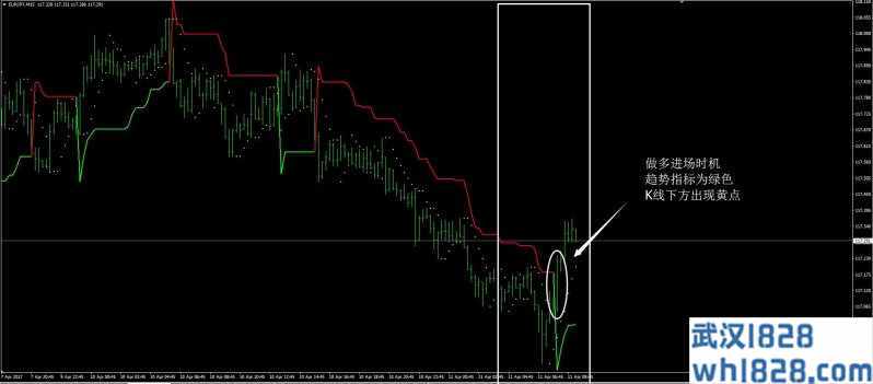 1.做多时机:超级趋势指标为上升趋势且线段为绿色;SAR指标显示买入信号,及K线下方出现黄点。