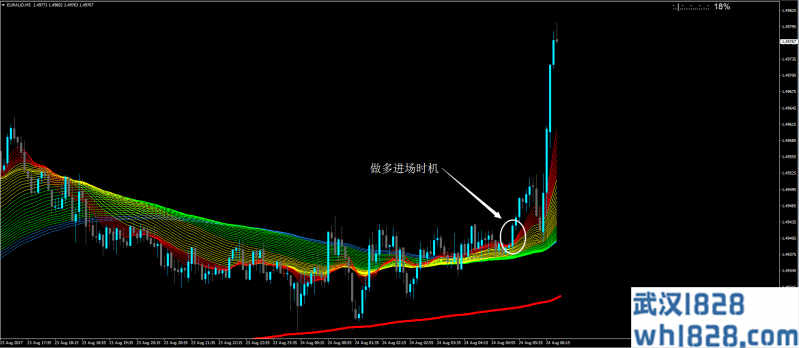 1. 做多时机:K线上穿彩虹色的移动平均线组合。