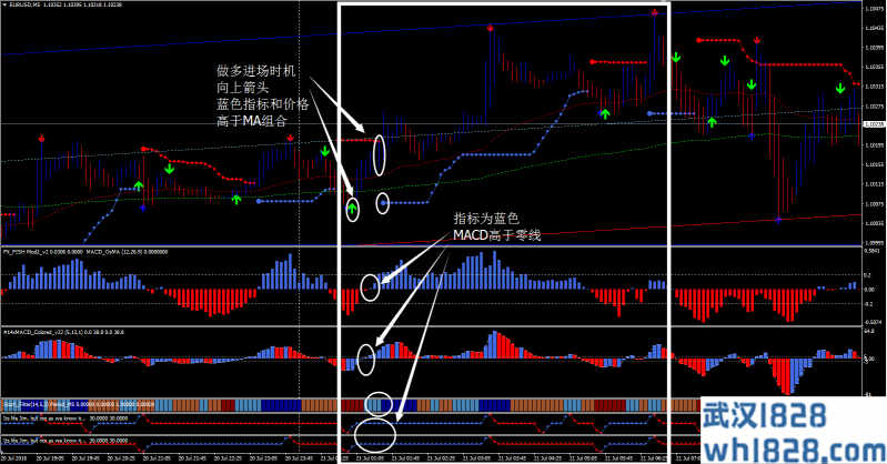 A.交易规则1.做多时机:出现向上箭头;蓝色蜡烛图在上升通道内且高于移动平均线组合(HMAS);布林线(Boll)指标为蓝色;MACD高于零线;费尔德指标(Fisher)为蓝色。