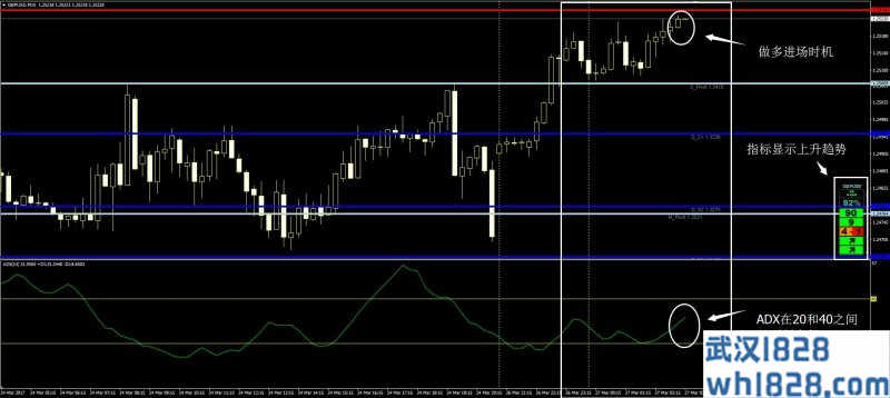 1.做多时机:警报系统提示上升趋势强度增强信号;建议当前价格距离多时间框架枢轴点指标(Pivot)中最近的阻力位超过20个点(pips)-仅针对长线交易(大时间周期);ADX指标上行,并且在水平位20至40之间;左下角概率测试器指标为绿色,并且显示上行的信号。