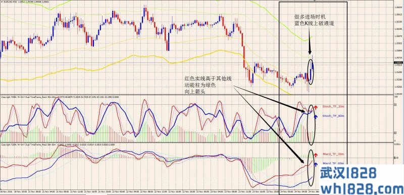 1.做多时机:K线蜡烛图对布林线通道指标(Envelope)上穿;双时间框架MACD指标红色实线高于其他线,动能柱为绿色且上行;双时间框架KDJ随机指标(Stochastic)红色实线高于其他线,动能柱为绿色且上行;以上两个指标的提示箭头为向上(不强制)。